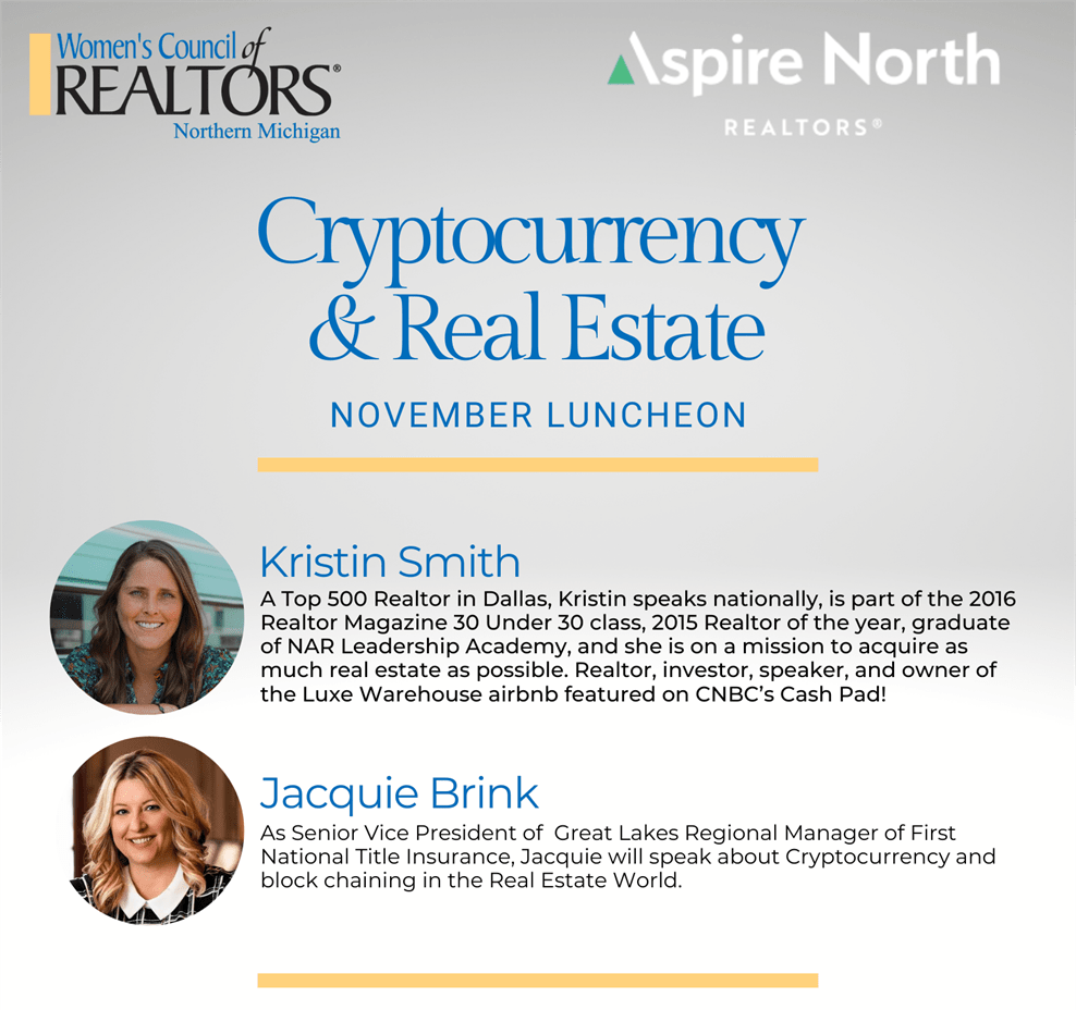 Next Thursday, November 17th, Women's Council of REALTORS® is hosting nationally recognized speakers for their November luncheon, Cryptocurrency & Real Estate. Through a collaboration with WCR, we are thrilled to offer a live stream of the event at the Aspire North building. Our members are welcome to come to the office to watch a Zoom of the lecture and earn 2 hours of legal CE credit.