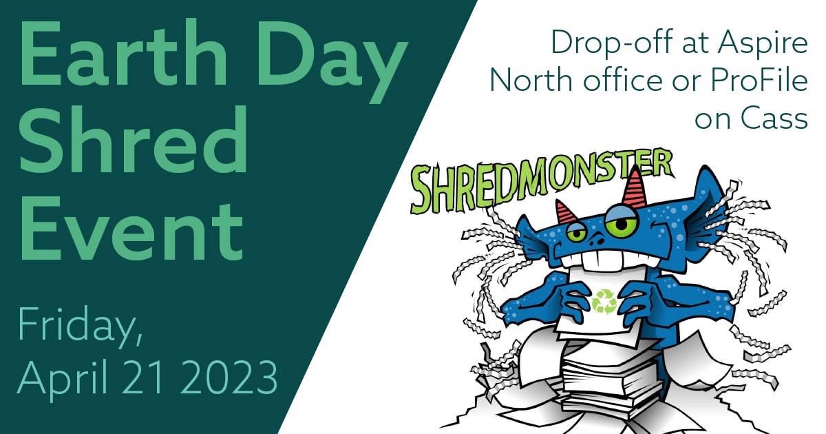 In the spirit of Earth Day and spring cleaning, the Aspire North Sustainability Committee is thrilled to be hosting this Earth Day Shred Event. On Friday, April 21st from 10 am - 2 pm (the day before Earth Day), Aspire North will pick up the tab to shred and recycle your old documents securely with ProFile! So celebrate Earth Day with us and clean out all those old documents cluttering up your office!