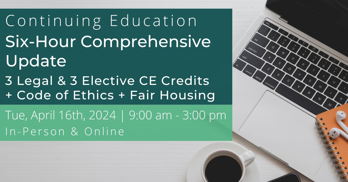 Six-Hour Comprehensive Update | 3 Legal, 3 Elective + Code of Ethics + Certified for the Fair Housing Requirement | In-Person or Online
